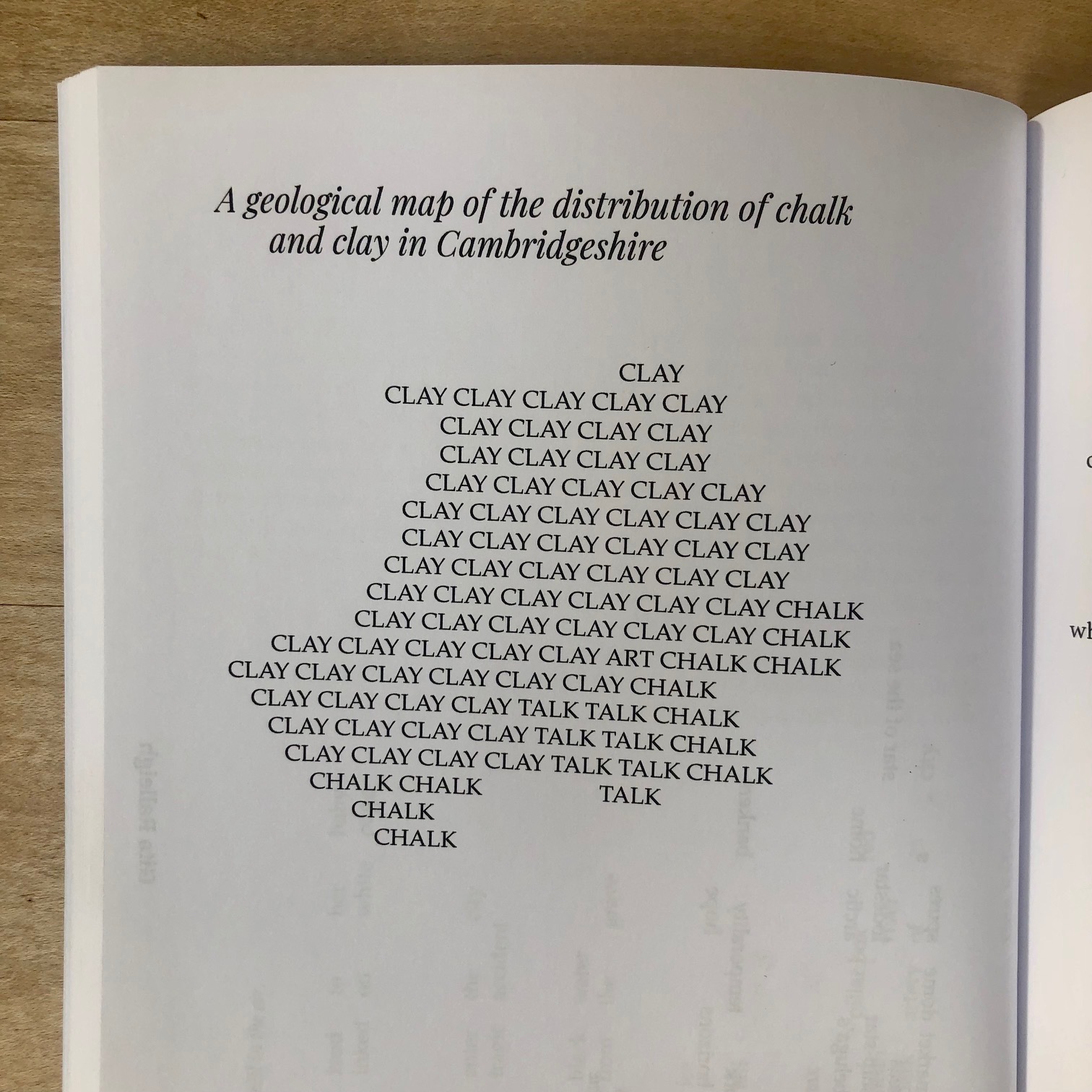 ‘A geological map of the distribution of chalk and clay in Cambridgeshire’ in Footprints, from Broken Sleep Books.